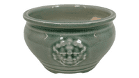 The bonsai pot has a round shape and a small lip.