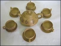 This teapot set is made with the famous Yixing clay from China. This teapot set is made from light brown clay.